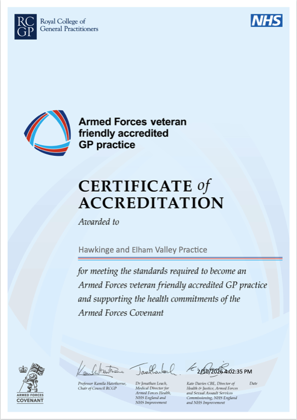 Hawkinge Health Centre is an accredited Veteran Friendly GP Practice.